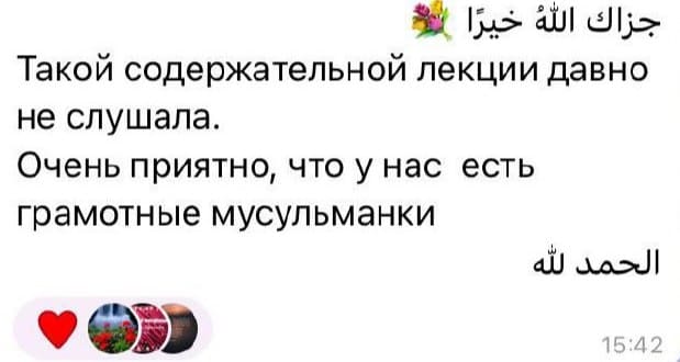 Также устаза подарит участницам курса урок про шариатский хиджаб женщины. Вы узнаете إن شاء الله , что же такое хиджаб, какие требования к нему предъявляет Шариат, чем отличается внешний хиджаб от внутреннего.